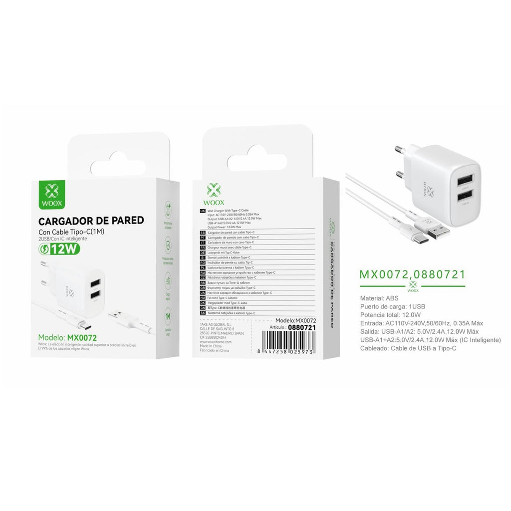 EU 5 V/2.4 A double USB wall charger with USB to type C cable (white) - MX0072 BL