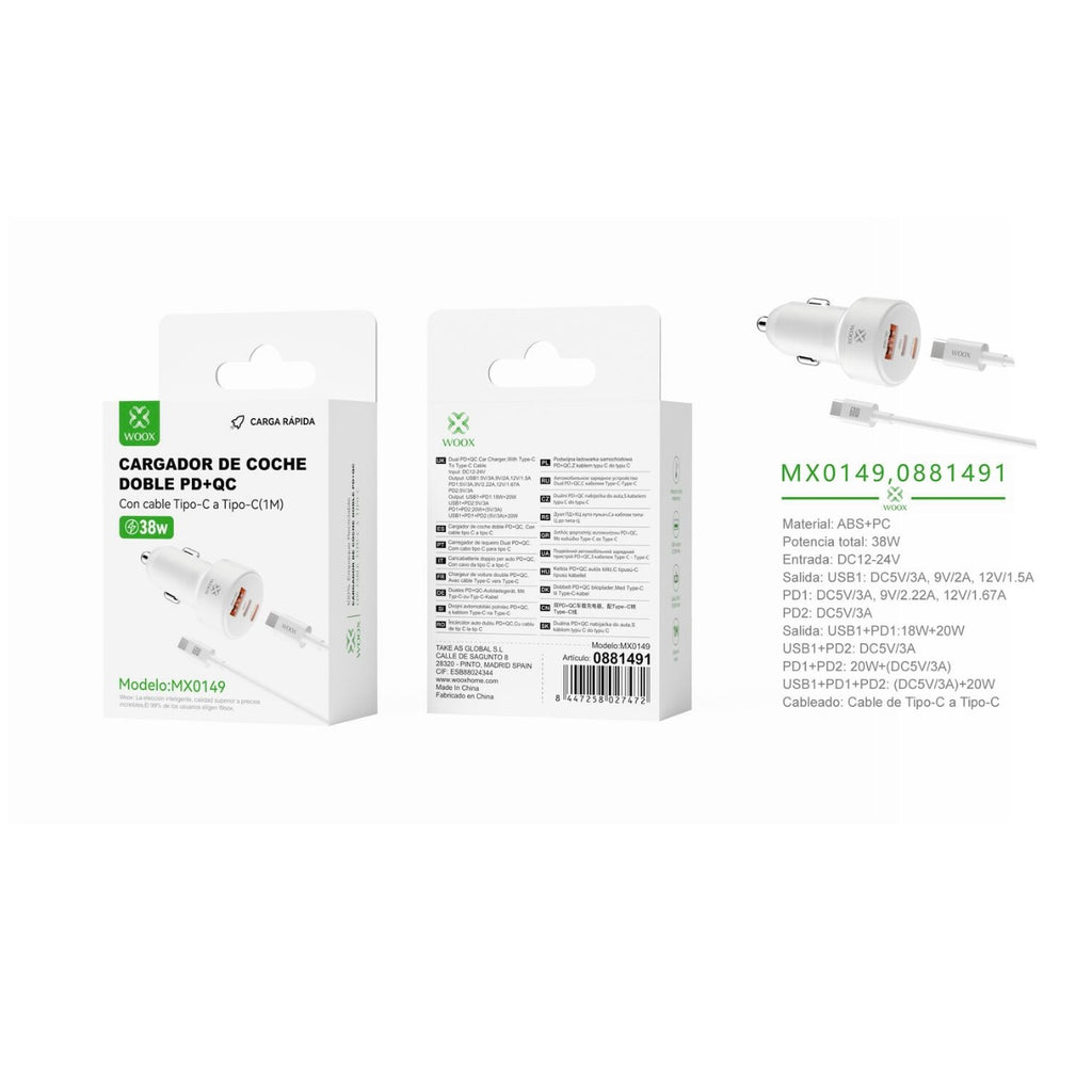 Cargador de coche PD*2+QC de 38 W con cable C- C (blanco) - MX0149 BL