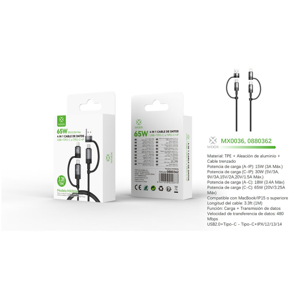 Cable de datos 4 en 1 USB+Tipo C a Tipo C+Lightning 65W 1 m - Negro - MX0036 NE