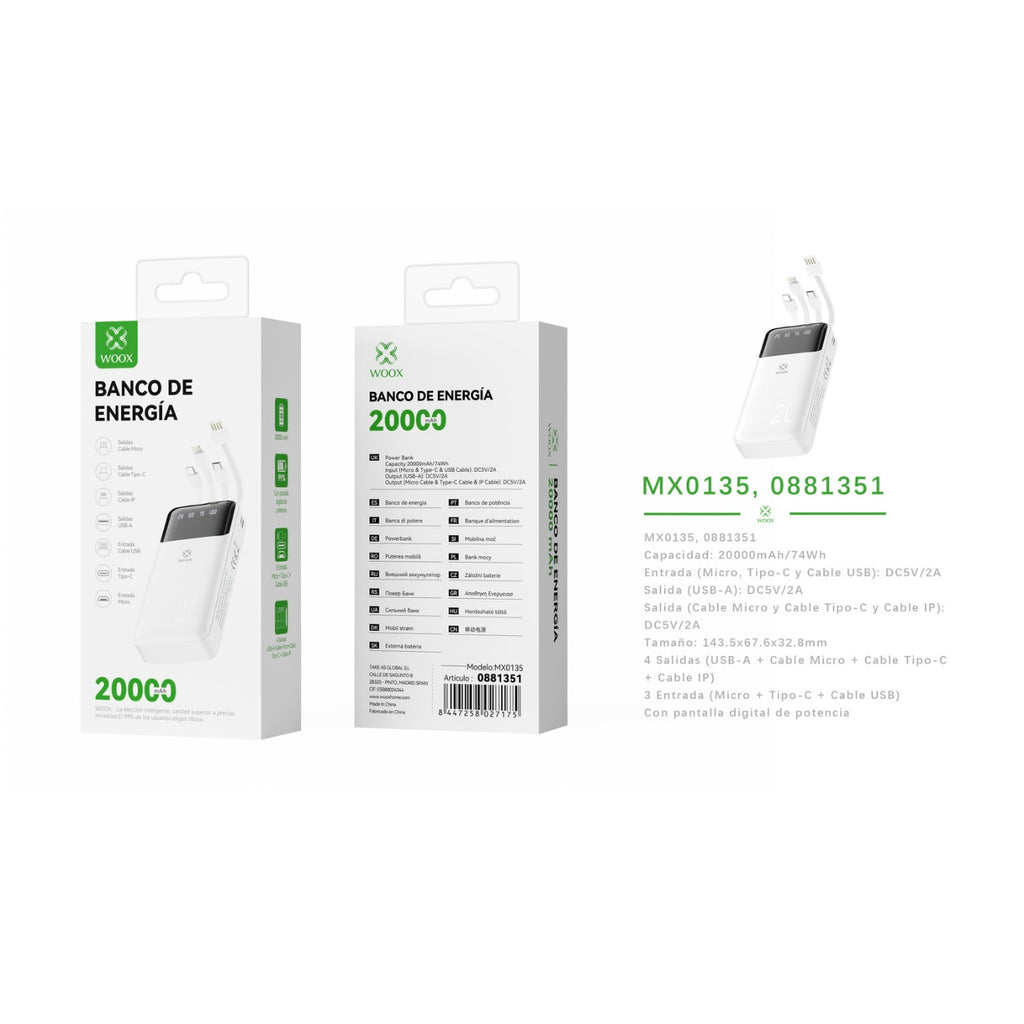 Banco de energia 20000 mAh 5 V 2 A con 4 cables ABS + PC - blanco - MX0135 BL