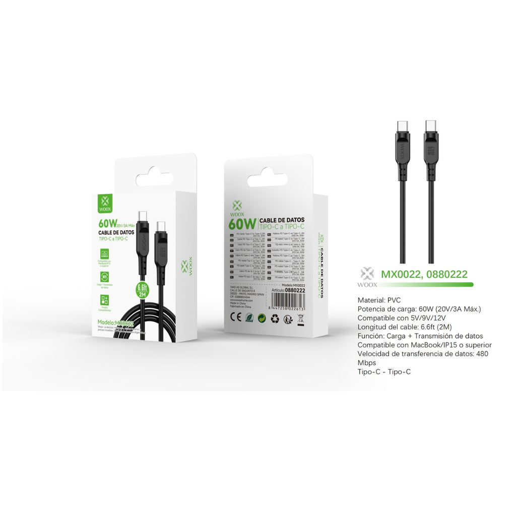 Cable de datos Tipo-C a Tipo-C 60W 2m - Negro - MX0022 NE